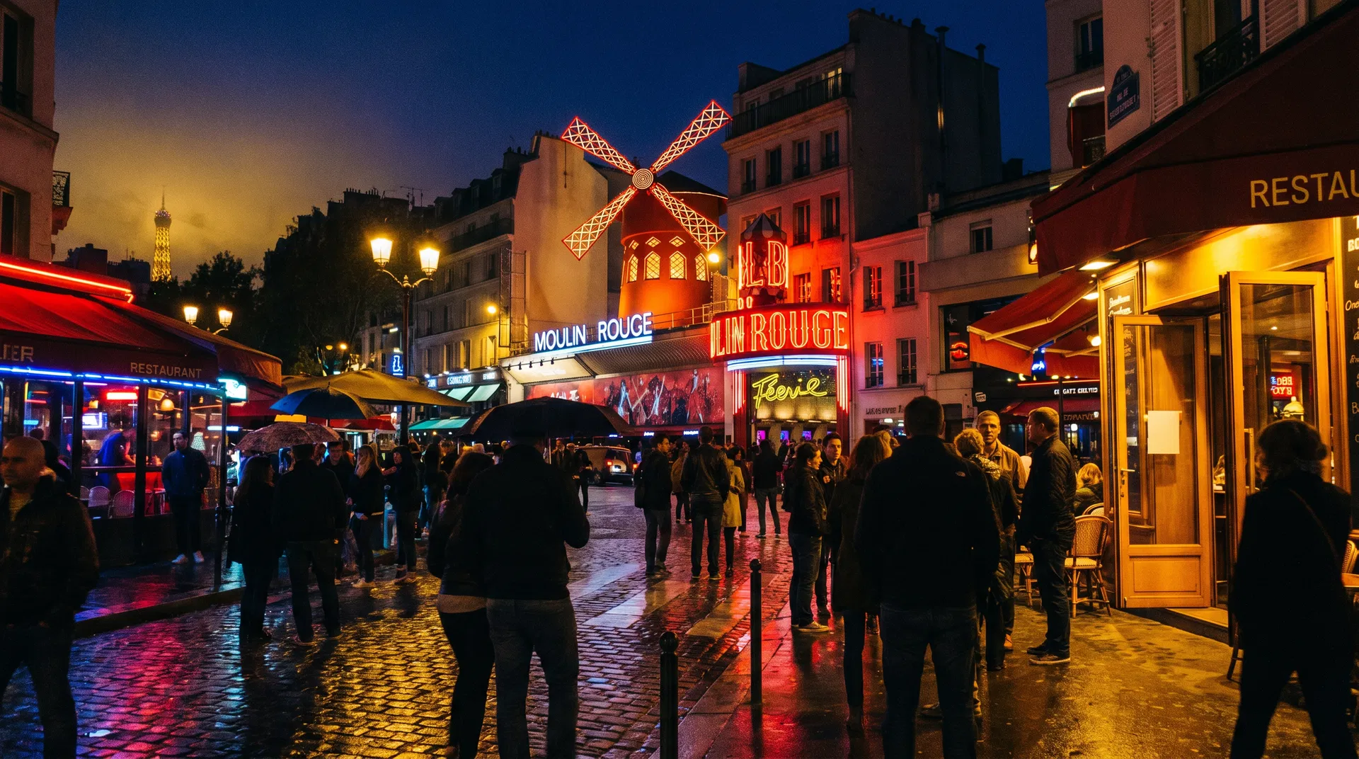 Moulin Rouge neon lights at night in Pigalle, Paris, with crowds on wet cobblestone streets